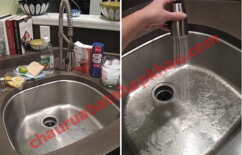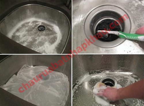 Để sử dụng bột baking soda, bạn làm ướt chậu rồi rắc một ít baking soda lên trên để một lúc rồi rửa sạch. Cách làm này sẽ giúp chậu rửa bát không những sạch bong mà còn sáng bóng đến bất ngờ. Ngoài ra, bột baking soda còn có tác dụng tốt để làm sạch chặn rác và khử mùi ống nước thải có mùi khó chịu